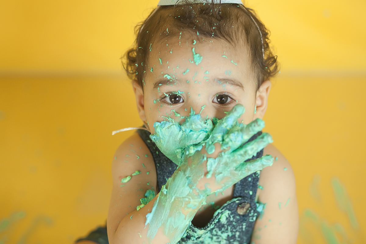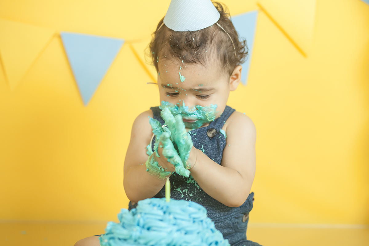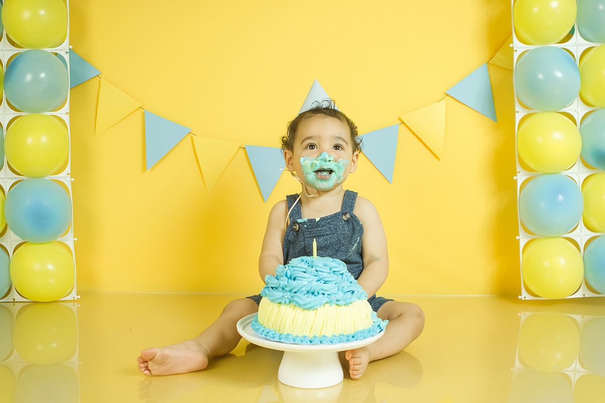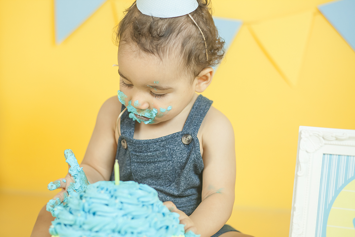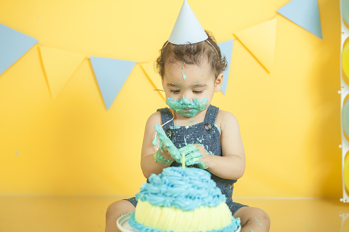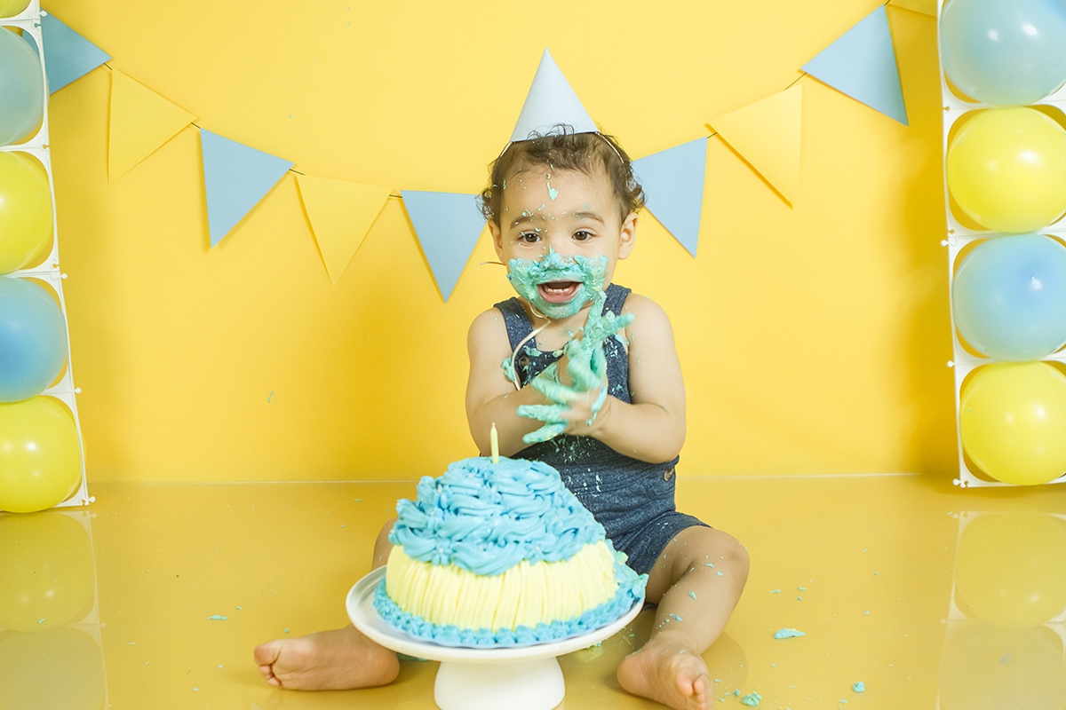 O Murilo se divertiu muito no seu ensaio Smash the cake! Ele se jogou na brincadeira e curtiu de verdade conhecer as texturas e gostos de um bolo de aniversario!